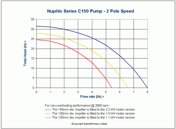 Home | Nuphlo | Nuphlo Centrifugal Pumps | Model C150 Centrifugal PumpModel C150 Centrifugal Pump Model C150 Centrifugal PumpSpecifications: Maximum capacity @ 2850 rpm: 24m³/hr Maximum pressure @ 2850 rpm: 3.6 bar Inlet diameter: 40 or 50mm (1½” or 2”) Outlet diameter: 40mm (1½”)